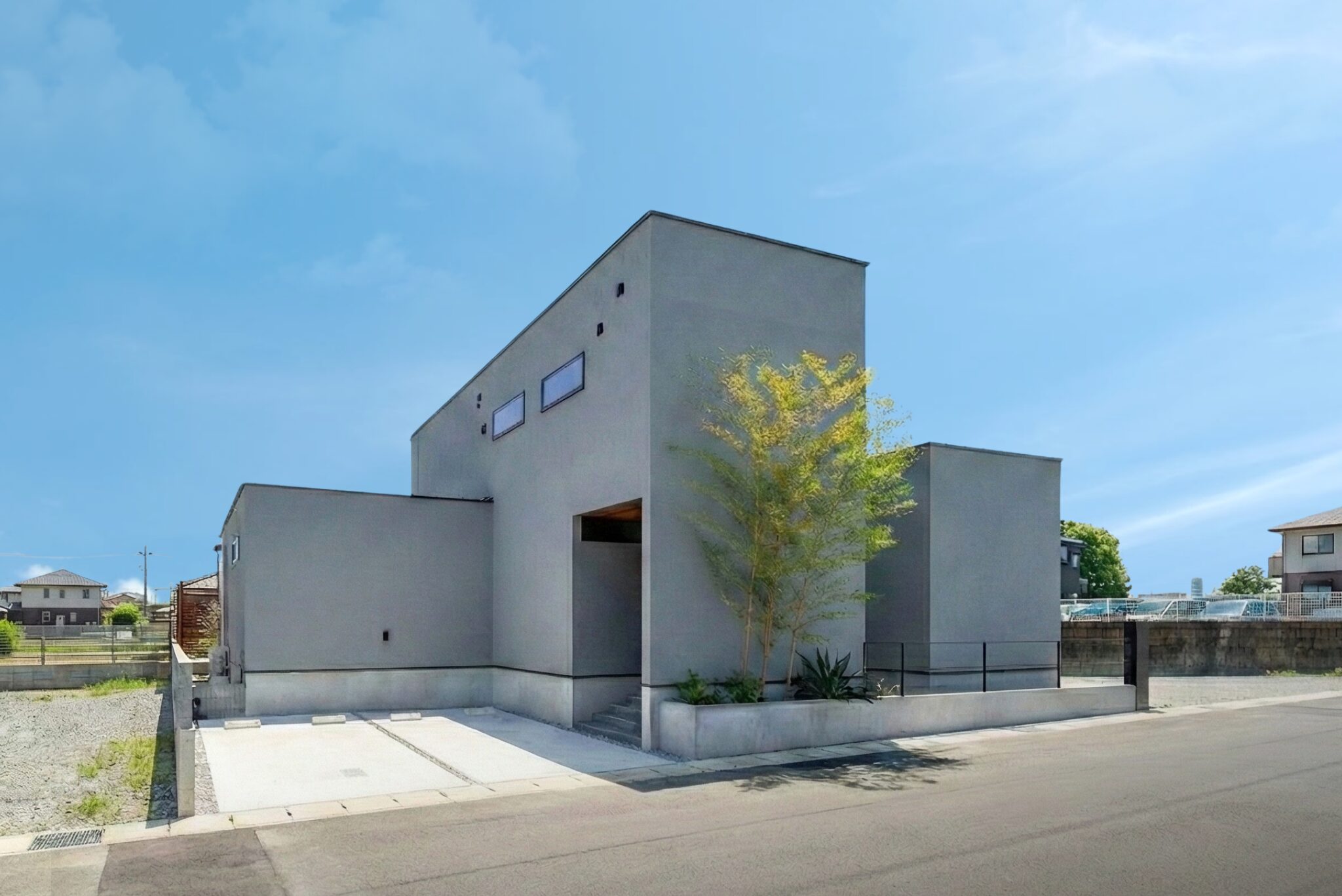 水平ラインを意識したフォルムが重厚感を演出しつつ、タイルデッキへとつながる開放的な設計で、外と内が心地よくつながる住まいです。