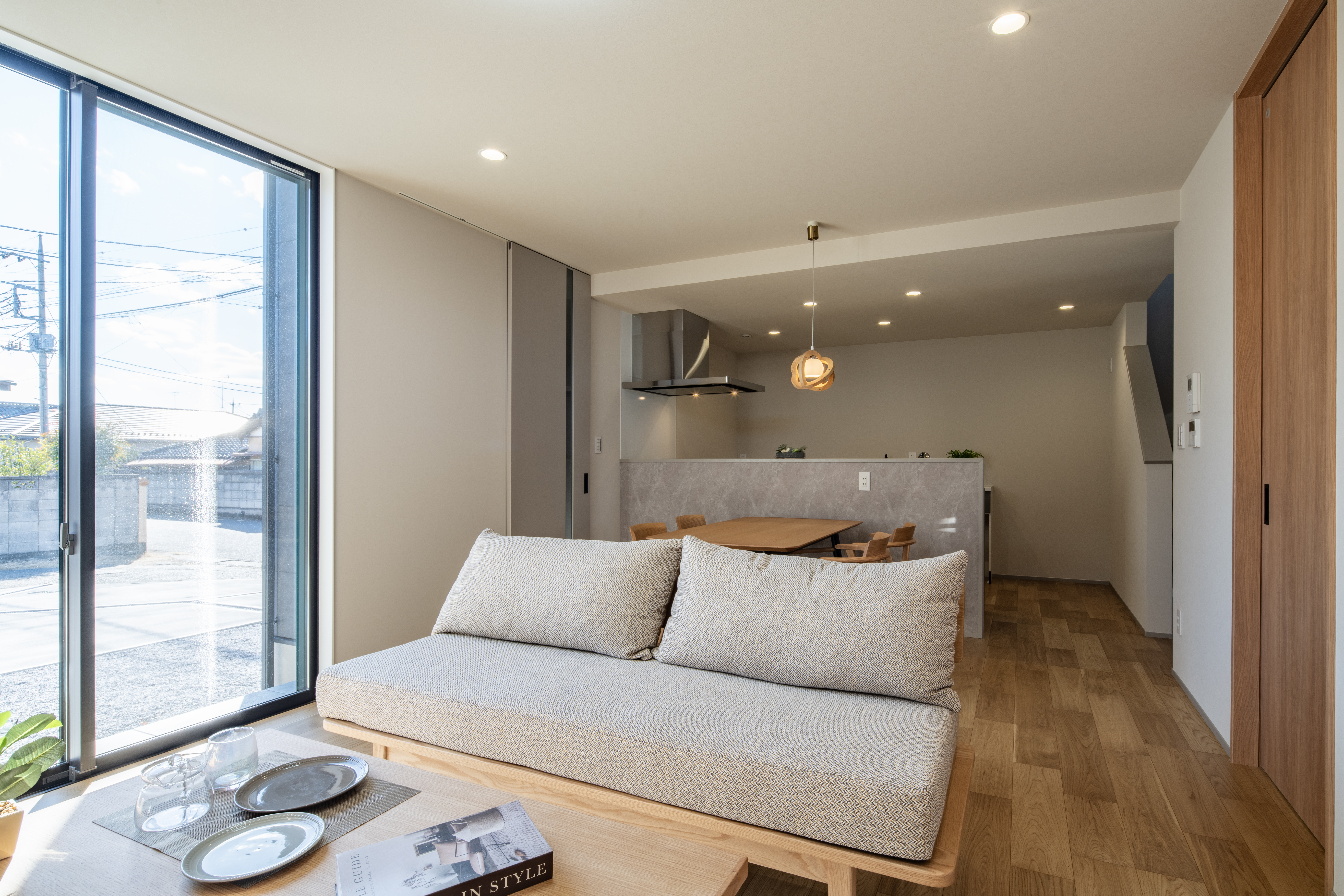 リビング側には大きめの掃出し窓で南から明るく、キッチン側は階段上からほのかに明かりが入るようにしています。