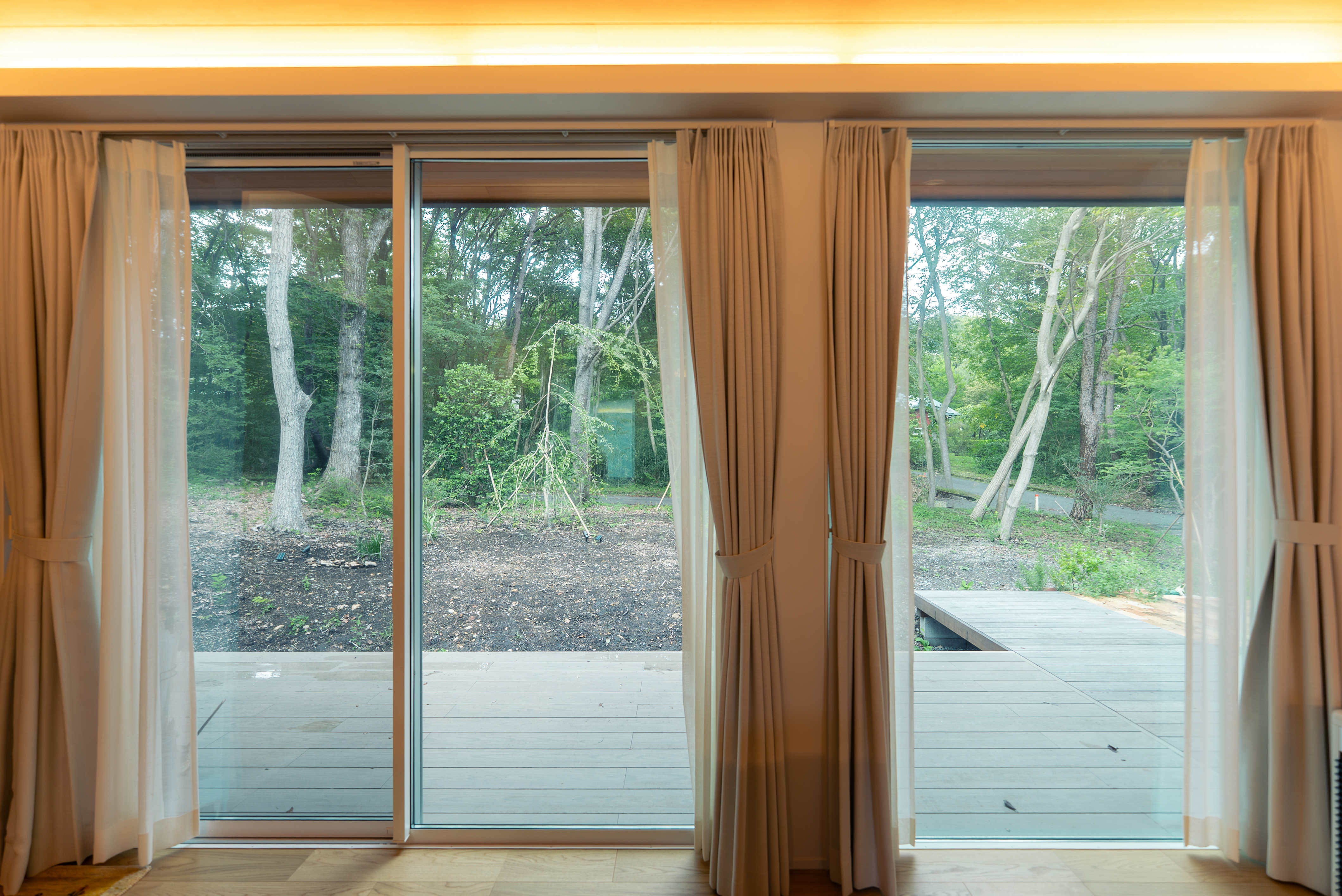 床から天井までの大開口が外の自然を室内に取り込み、四季の移ろいを感じる。内と外をつなぐウッドデッキが印象的。