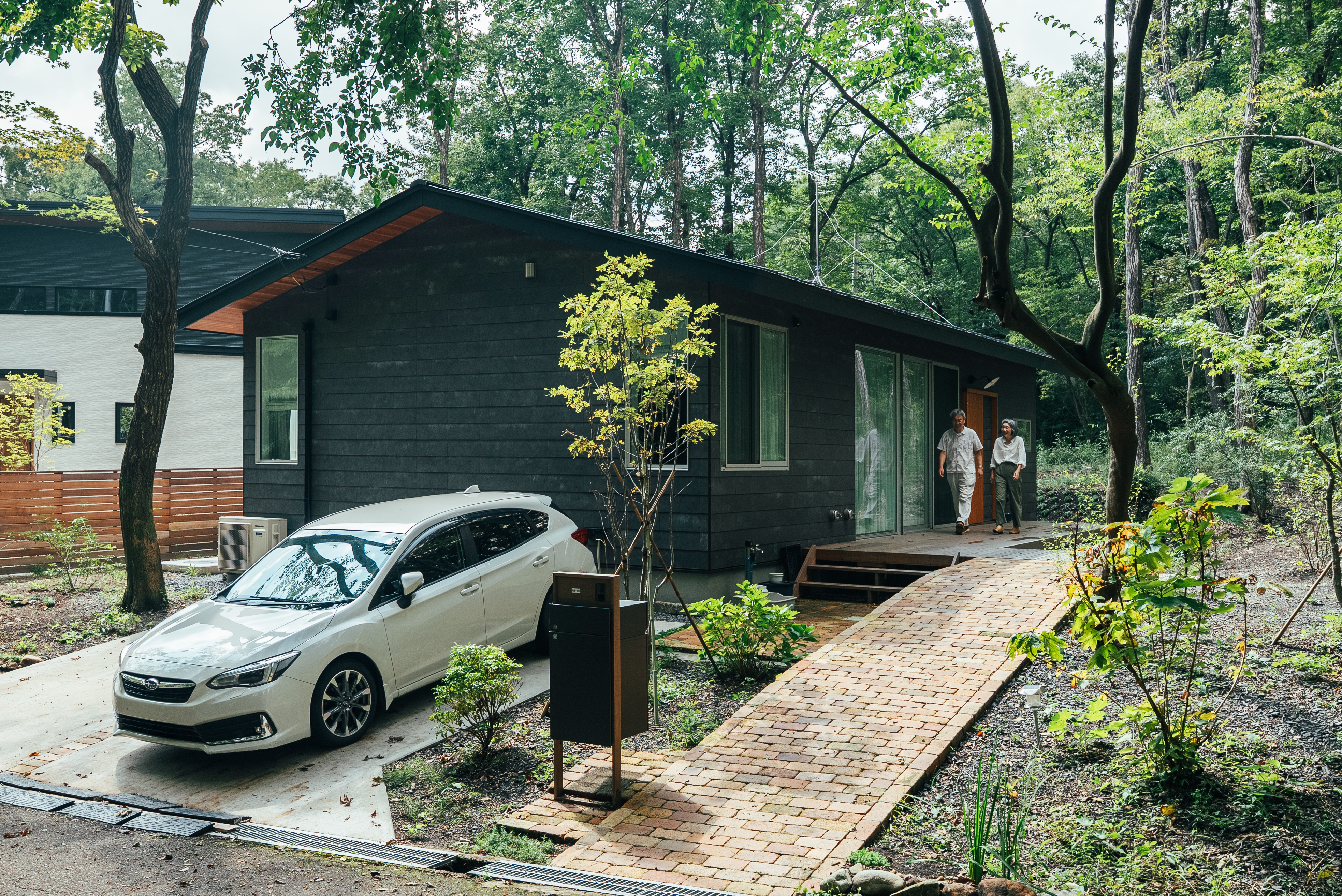 森に溶け込む平屋住宅。深い軒と黒い外壁が落ち着きを演出し、自然素材の小径が玄関へと導く。車寄せも緑に調和している。