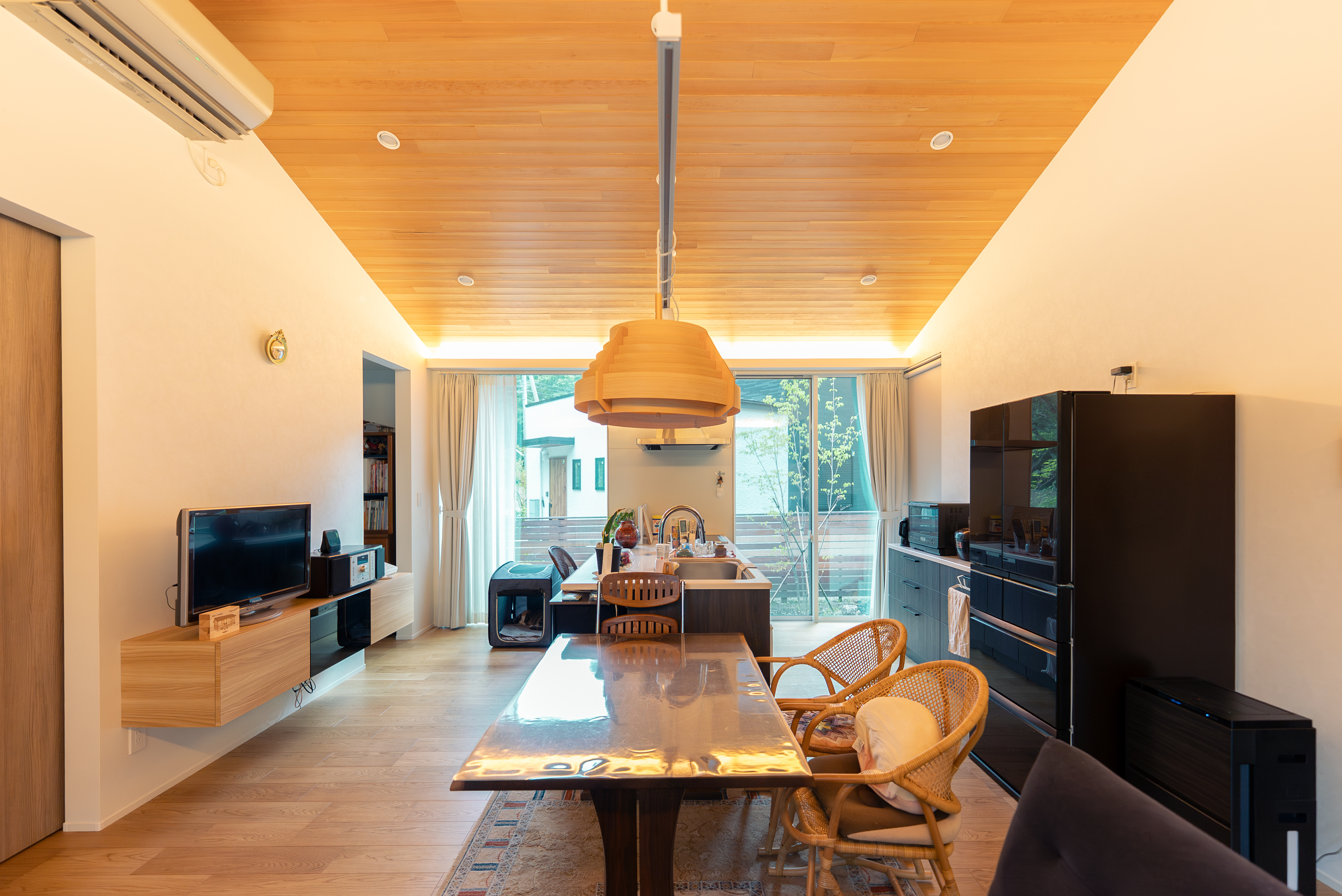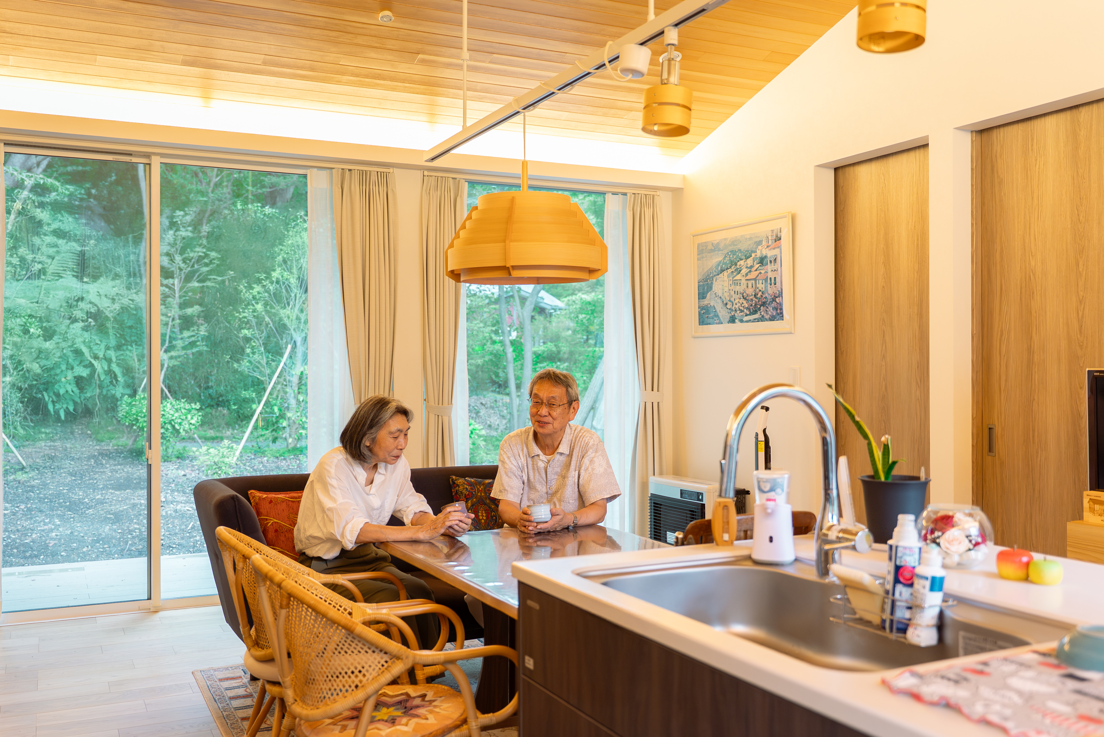 大開口の窓から緑を望むリビング。木の温もりと柔らかな照明が調和し、穏やかな時間を過ごせる空間構成となっている。
