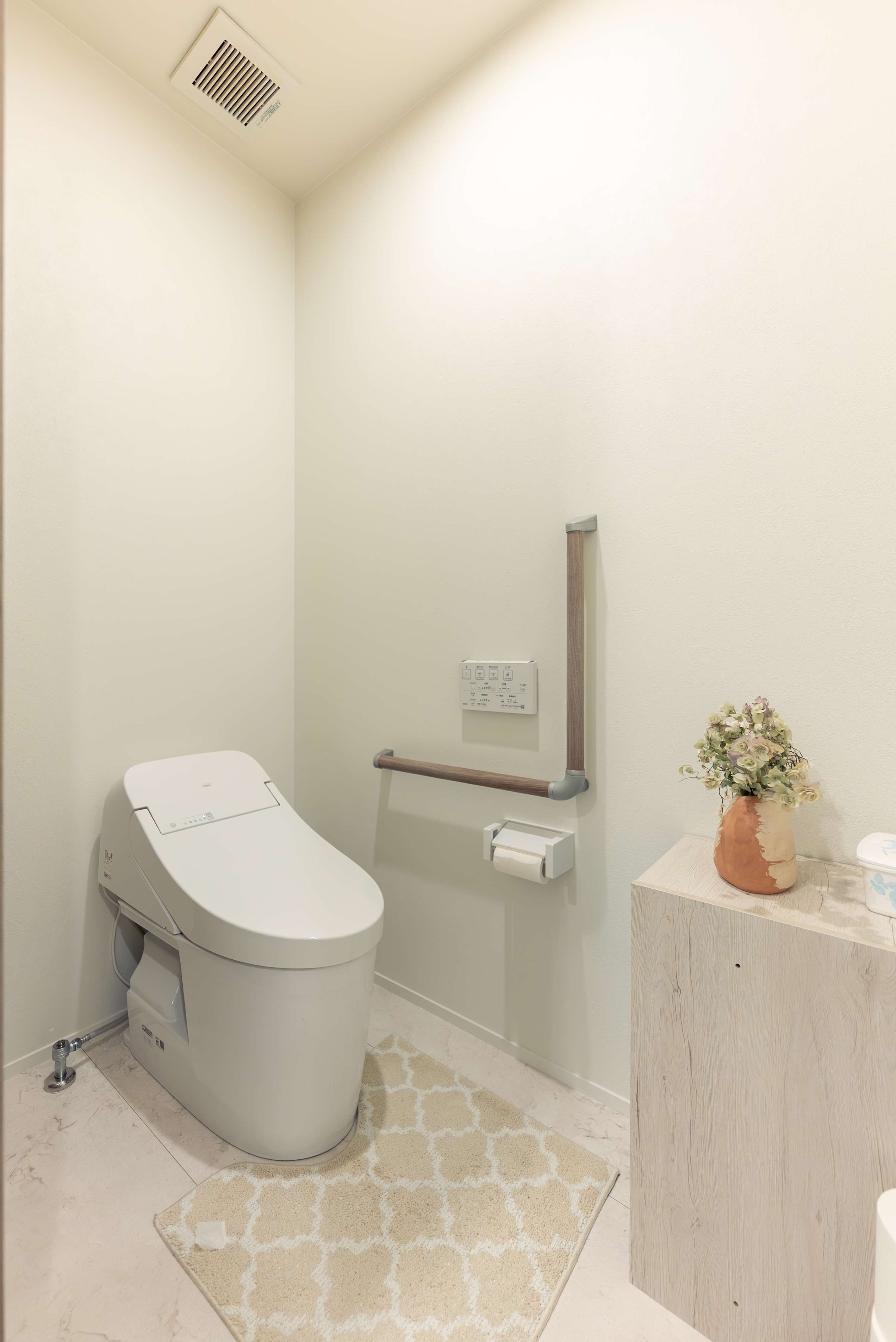 明るく清潔感のあるトイレ。手すりを設け、安全性と快適性を両立。落ち着いた色合いで誰にでも使いやすい設計。