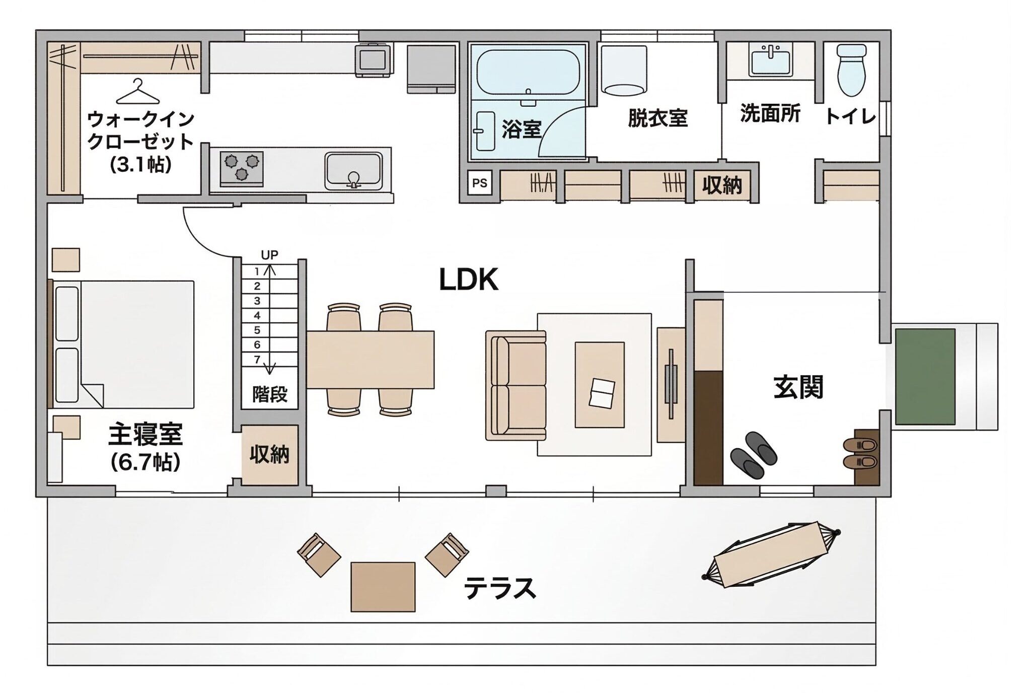 毎日の家事や身支度が効率よく行え、忙しい共働き世帯にも嬉しい動線計画。