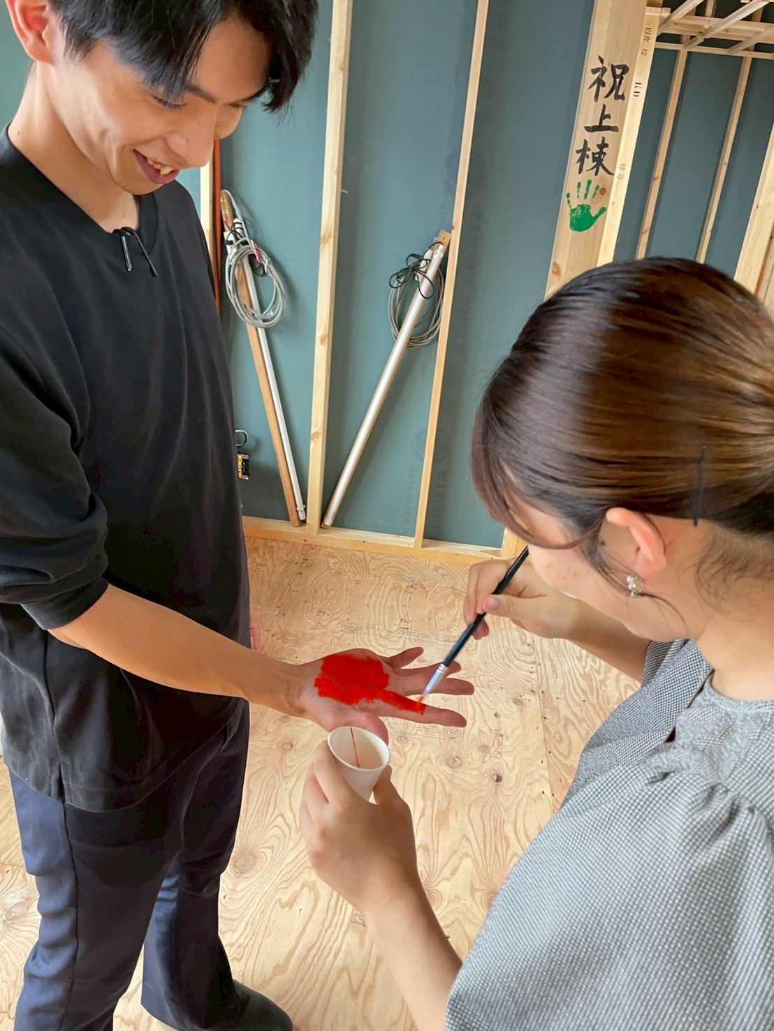 柱や梁に、家族みんなの好きな言葉や大切にしていることを書き込み、手形をぎゅっと。